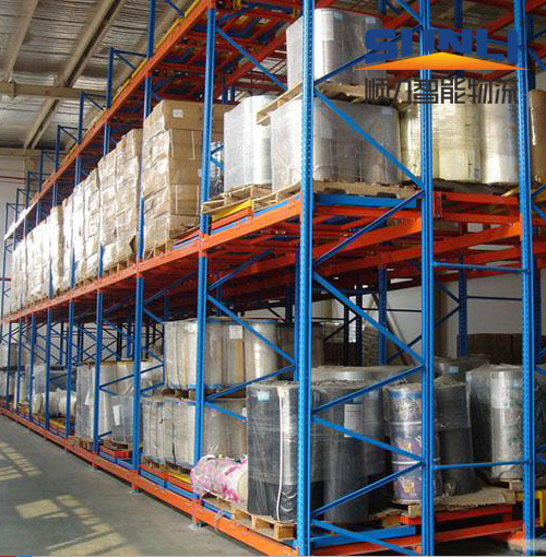 在前后梁间以多层台车重叠相接,从外侧将叠栈货物置于台车推入,后储存之货品会将原先货品推往里面材质:钢制