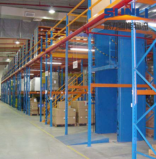 通常使用中型层板式货架或重型横梁式货架做主体,配合叉车或液压升降平台上下楼上货物。多层搁楼式货架能够简单高效的利用仓库空间。